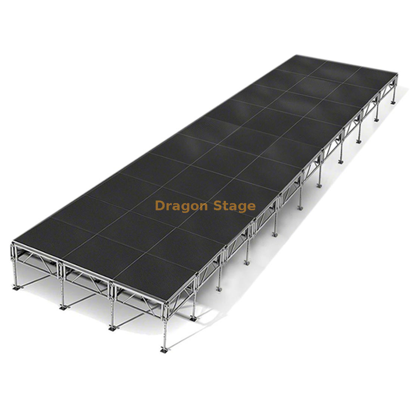 Алюминиевая сцена предлагает не только функциональность, но и эстетическую привлекательность. Его элегантный дизайн и полированная отделка добавят элегантности любому событию. Кроме того, сцену можно персонализировать, используя различные варианты поверхности, например ковровое или нескользящее покрытие, в соответствии с темой и стилем вашего мероприятия. Такая гибкость позволяет вам создать сцену, которая идеально дополнит желаемую атмосферу.