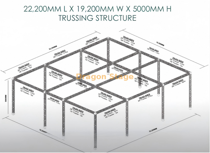 Эта профессиональная модульная ферменная система отображения размером 21 х 17 м представляет собой структурное решение промышленного уровня, предназначенное для огромных выставочных залов и брендинга широкоформатных мероприятий. Общая занимаемая площадь 22 200 мм в длину и 19 200 мм в ширину обеспечивает беспрецедентную подвесную решетку для сложного освещения, вывесок и подвешивания продуктов.