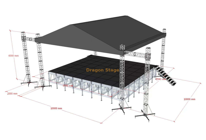 Эта профессиональная двухскатная стропильная система размером 10 x 10 м представляет собой высокоэффективное структурное решение, предназначенное для элитных мероприятий, где эстетика и несущая способность имеют решающее значение. Эта система, расположенная на высоте 6 метров по вертикали, обеспечивает обширную зону выступления площадью 100 квадратных метров со встроенными аудиовизуальными возможностями.