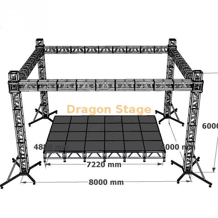 Расширенное покрытие: алюминиевая ферменная конструкция размером 8 x 6 x 6 м обеспечивает значительную пропускную способность для профессионального осветительного оборудования, звуковых систем и визуальных дисплеев.