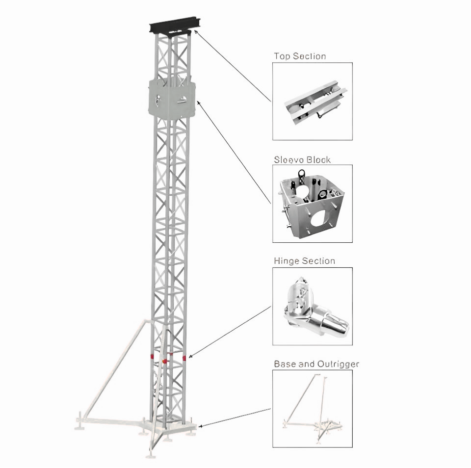 Ферменная башня функционирует как полностью интегрированная структурная система, состоящая из верхней секции, стандартных секций фермы, рукавного блока, шарнирной секции, а также основания и выносных опор.